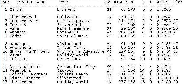 Note: Scroll to the bottom for links to the results for all 175 wooden roller coasters worldwide.