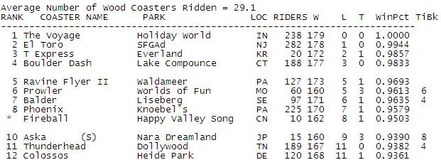 losing mutual-rider comparisons to the top three wooden coasters and to two Mexican rides.